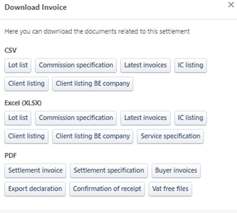 In ATLAS, sellers have the ability to access and download several documents containing information for the financial closure of an auction. These documents are comprehensive, providing a detailed account of different aspects of the transaction. Examples of these documents include but may not be limited to Settlement specification, Settlement invoices, Buyers Invoices, Lot listing, Commission specification, Client listing, Service specification, Export declaration, and VAT free files.