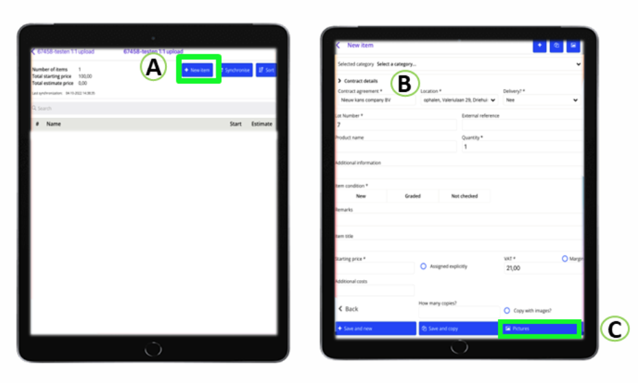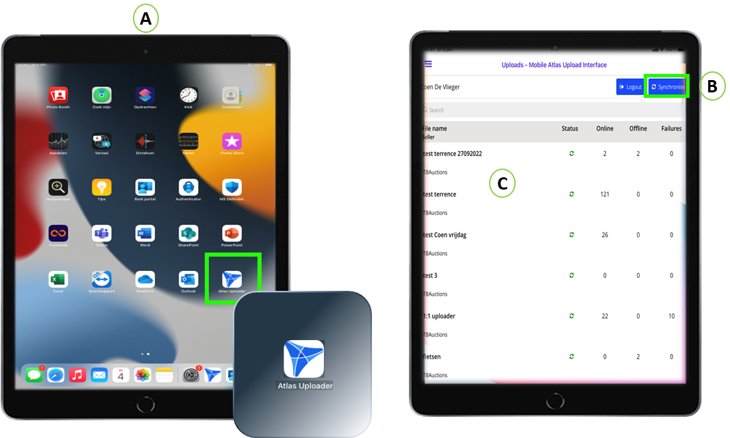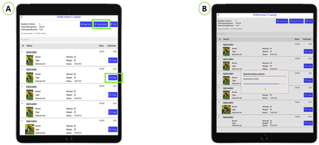 b) When the auction is complete, select Synchronise (B) to copy and synchronise all items from your iPad to the ATLAS server
