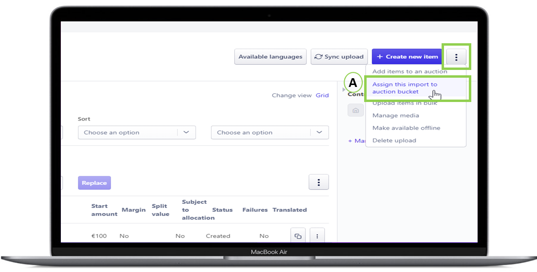 a) Hover over the vertical 3 dots on the top right. Choose Assign this import to auction bucket. A pop-up with auction buckets will be displayed. Select the bucket you want to add the items to and confirm.