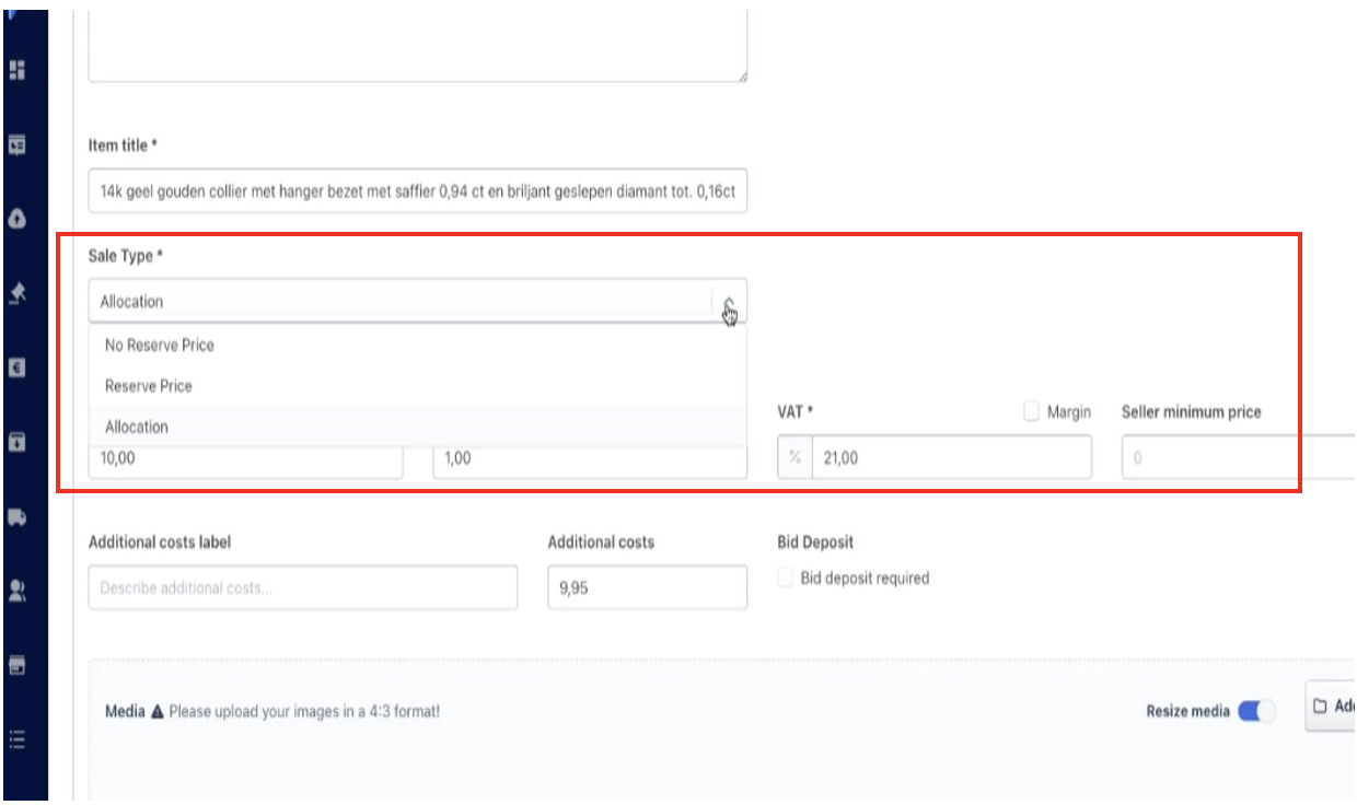Select Sale Type (No Reserve Price, Reserve Price, Allocation). Then complete the associated field and upload the items. See definitions in the glossary below.